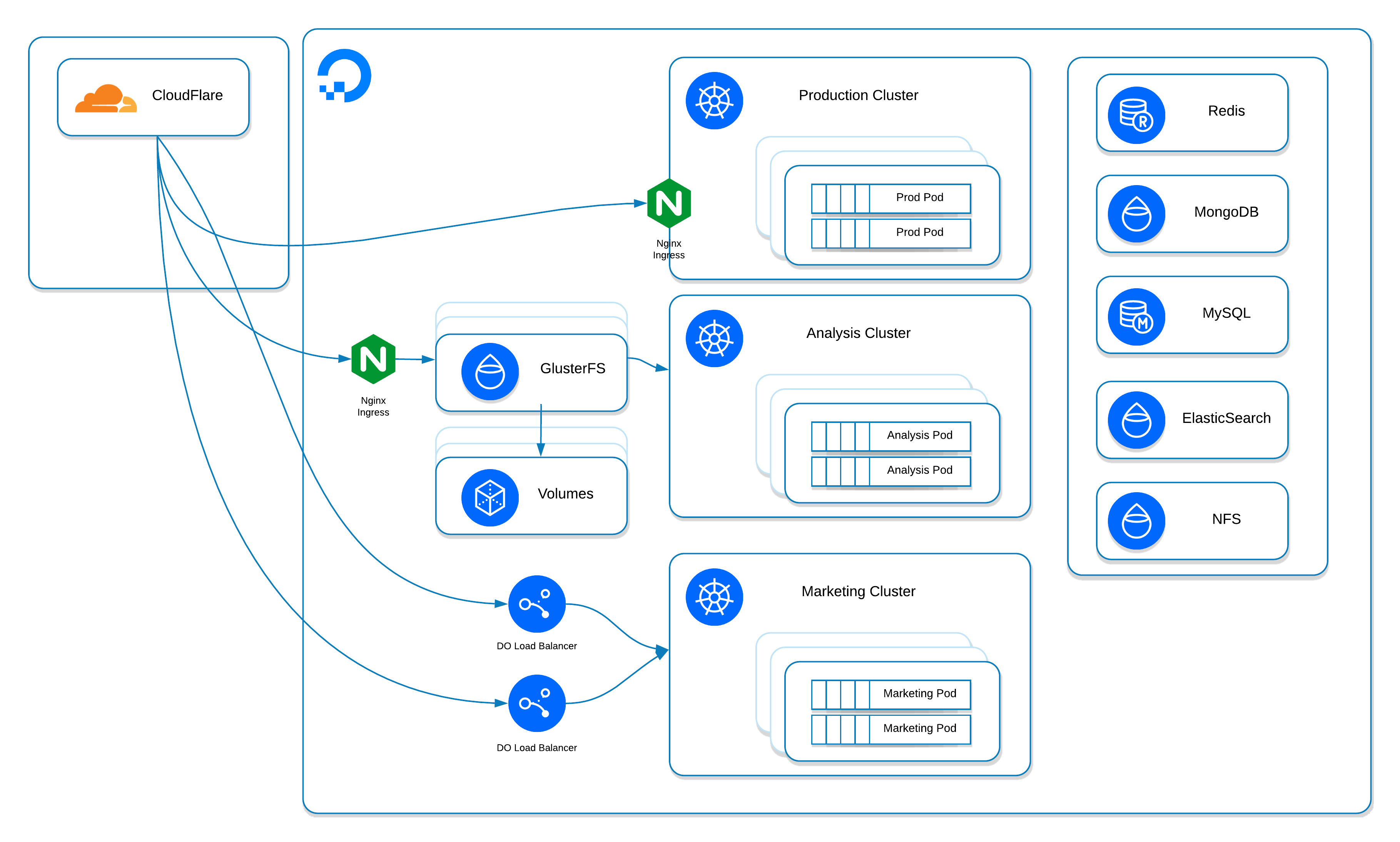 Atom Learning runs three Kubernetes clusters, with multiple node pools, all of which run on DigitalOcean Kubernetes. Atom uses a microservices architecture on the backend that uses REST to communicate with each other and the frontend React app.