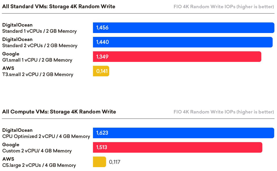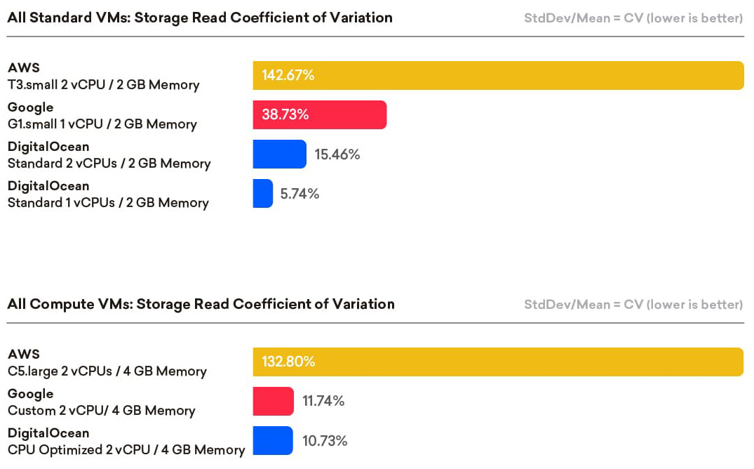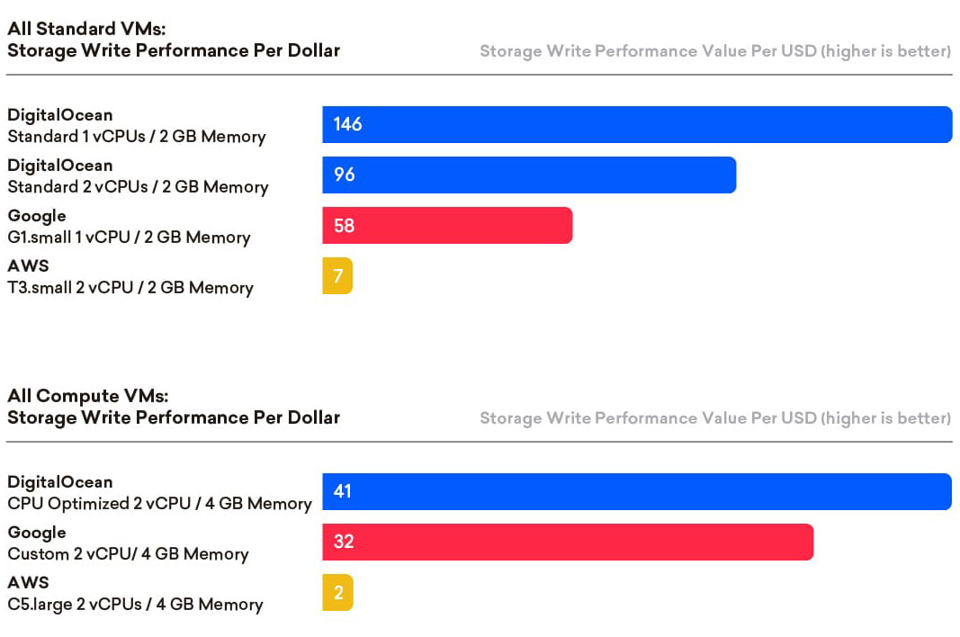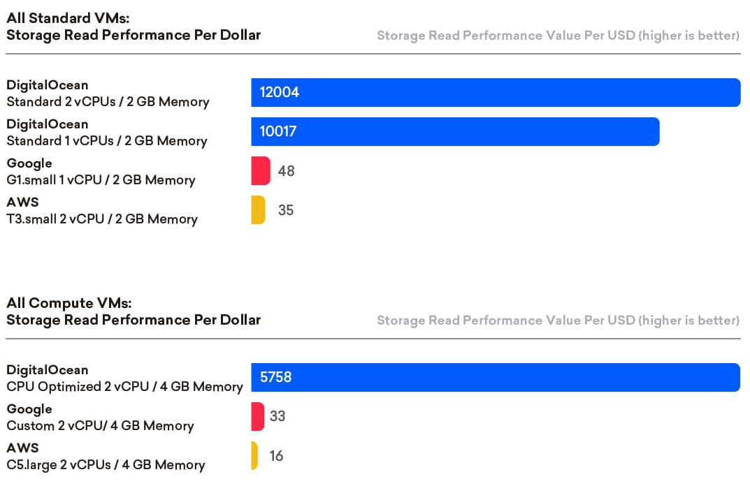In summary, DigitalOcean provides excellent storage price-performance for both read and write for all VM configurations tested, regardless of machine classification or size.