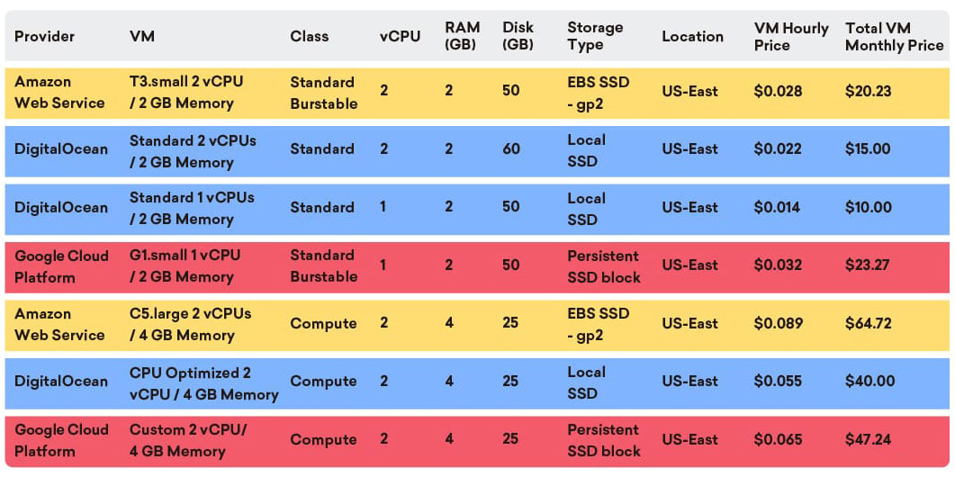 Figure 6.1 - DigitalOcean, AWS and GCP VMs tested and compared