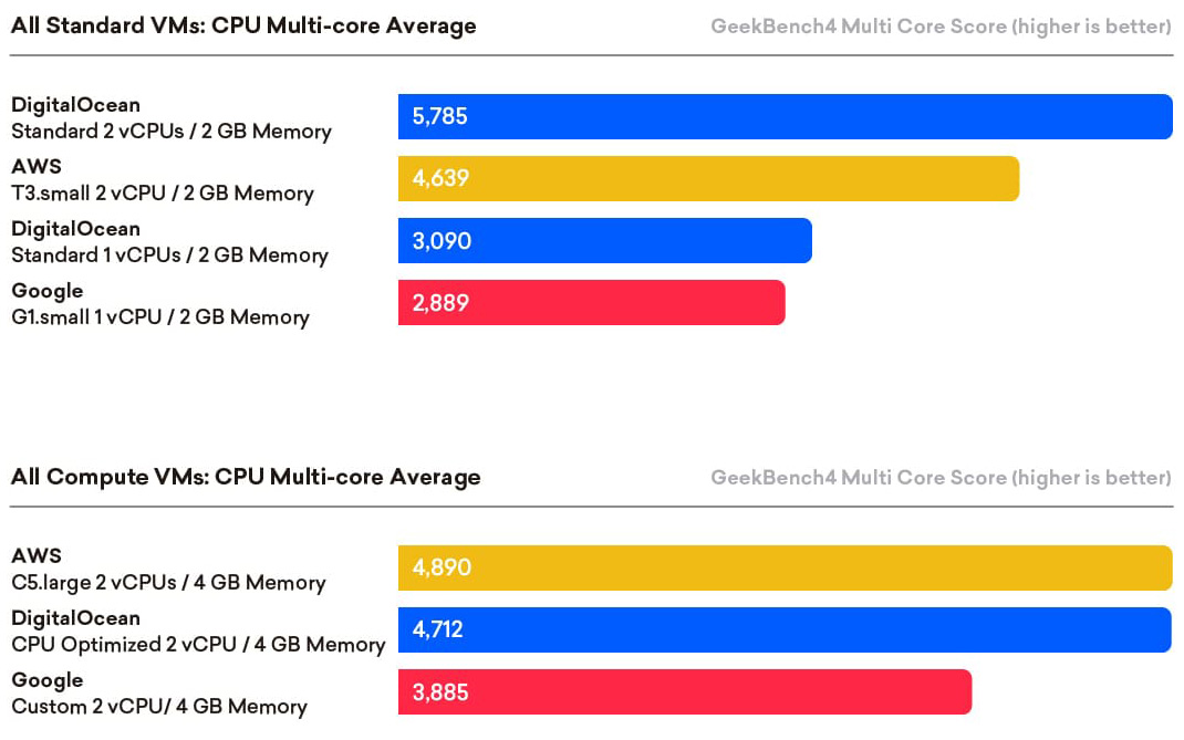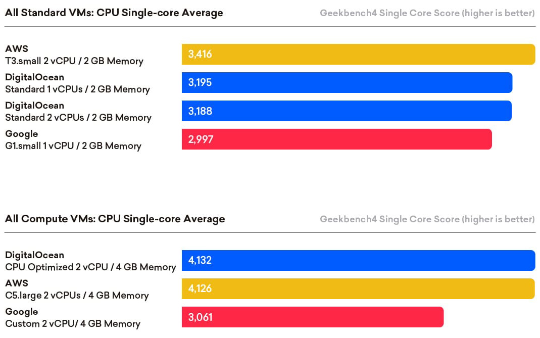 DigitalOcean commissioned Cloud Spectator to assess the performance of virtual machines (VMs) from three different Cloud Service Providers (CSP) or providers: DigitalOcean (DO), Amazon Web Services (AWS), and Google Compute Engine (GCE). Cloud Spectator tested the various VMs from these providers to evaluate the CPU performance, RAM and storage for each provider’s VMs. The purpose of the study was to understand the VM performance between Cloud providers with similarly-sized and classed VMs using standardized and repeatable testing methodology. Performance information for specified basic 1 and 2 vCPU 2GB and compute-optimized 2 vCPU 4GB VMs was gathered using Geekbench4 and FIO benchmarking tools for this analysis. Each VM type was provisioned with four duplicate VMs to limit sampling error. Data was then collected during 100 iteration tests.