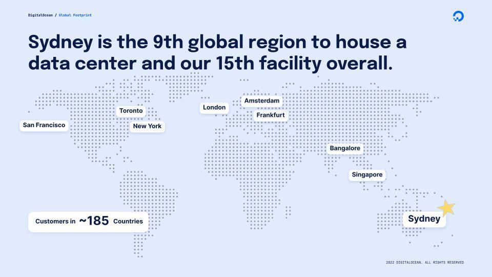 DigitalOcean provides robust infrastructure and reliable network connectivity to help you deliver exceptional customer experiences. Build and scale apps using our 15 globally distributed data centers along with a state-of-the-art datacenter in Sydney Australia.